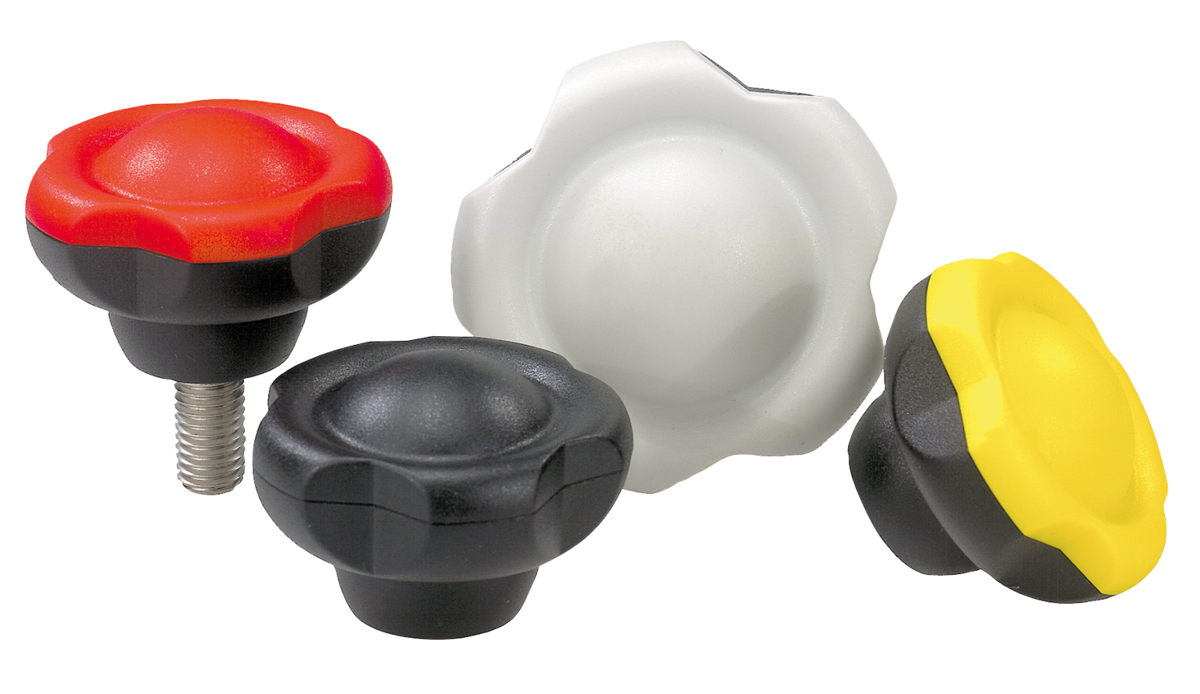 Pěticípé úchyty z plastu s krytem, závitová vložka z oceli nebo nerezové oceli, s vnějším závitem