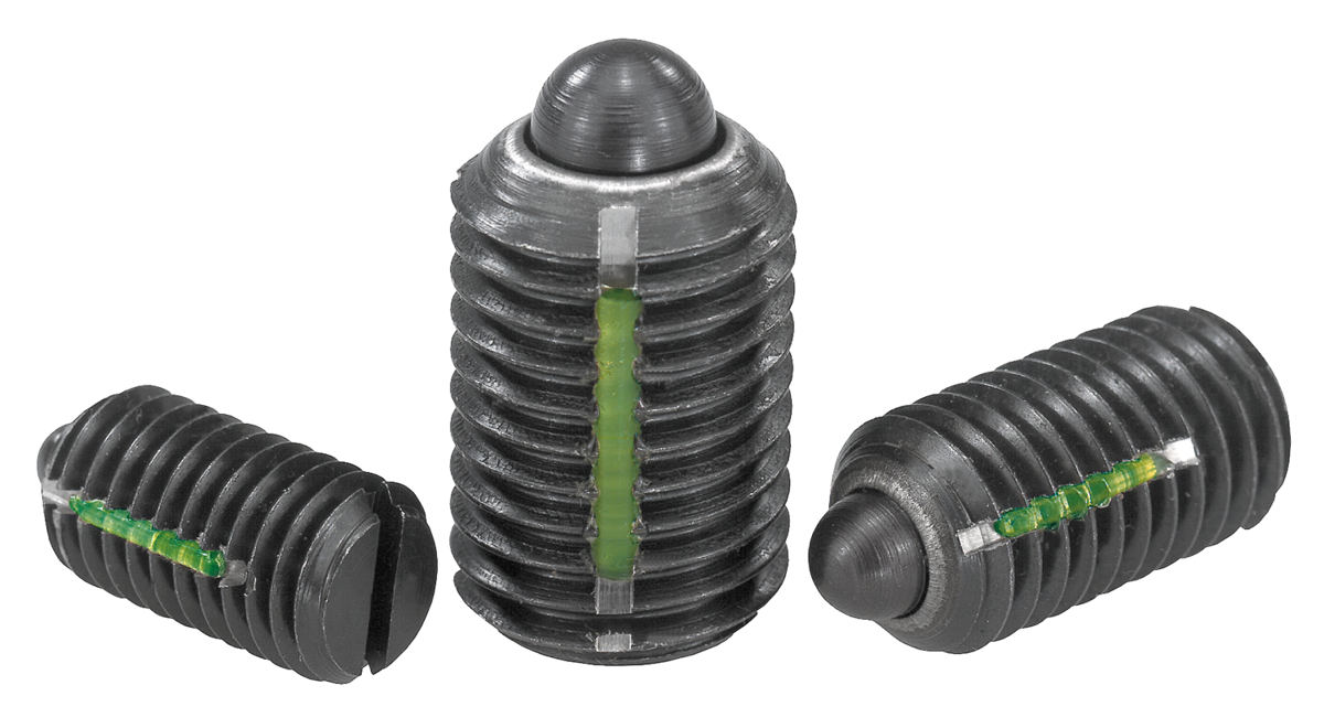 Pouzdra s odpruženou kuličkou, s drážkou, s tlačným kolíkem, z oceli, malá síla pružiny, se závitovou pojistkou