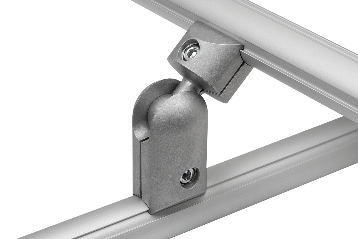 Pro variabilní křížové spoje. Kulovou křížovou spojku lze otočit o 180° stupňů. Díky tomu je vhodná pro připojení v jakémkoli prostorovém uspořádání. Umožňuje stabilní spojení křižových profilových trubek. Díky kuličkovému ložisku v kulové pánvi lze spoj otočit do požadované polohy a upevnit jediným šroubem.