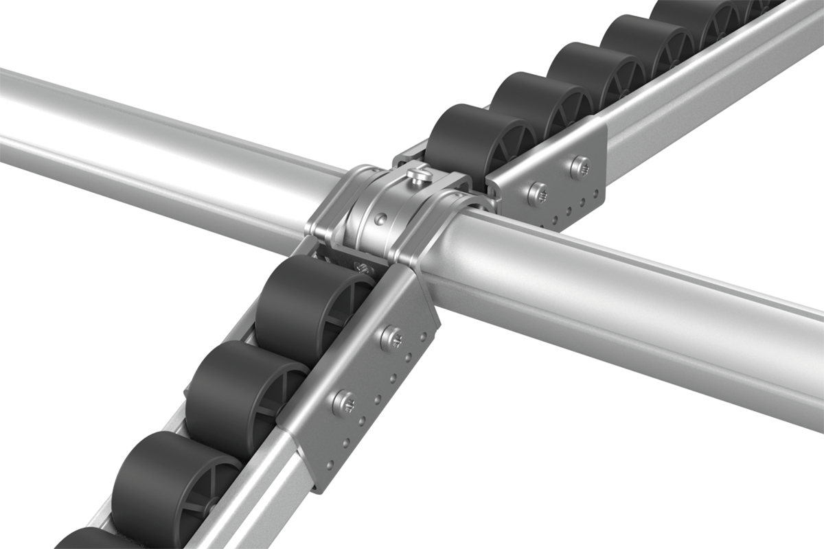 Válečkový dopravník zasuňte do hákového držáku a připevněte jej do kruhové trubky nebo profilové trubky Ø30. V případě potřeby lze závěsný držák také přišroubovat.