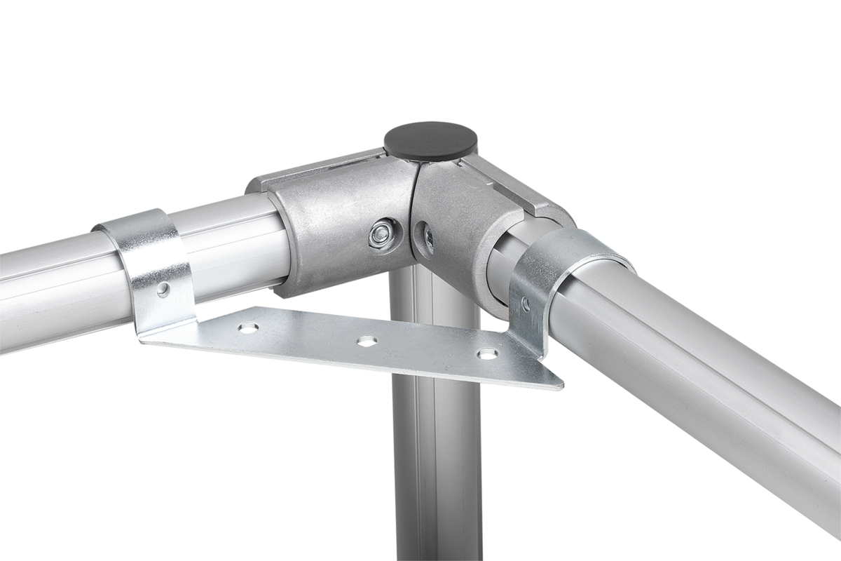 Robustní upevňovací prvek pro upevnění deskových materiálů. Odolná ocelová svorka je přišroubována k profilové trubce a zajišťuje tak bezpečné uchycení. Alternativně lze svorky nejprve přišroubovat k plochému prvku. Poté lze kompletní prvek jednoduše zavěsit na trubkový rám.