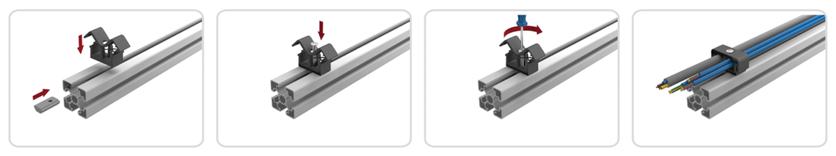 Montáž lze provést na ploché prvky nebo hliníkové profily (drážka 8 nebo 10 mm) pomocí šroubu s válcovou hlavou nebo čočkovitého šroubu a vložky do drážky. Upnutí kabelů proveďte pomocí vloženého O-kroužku.
