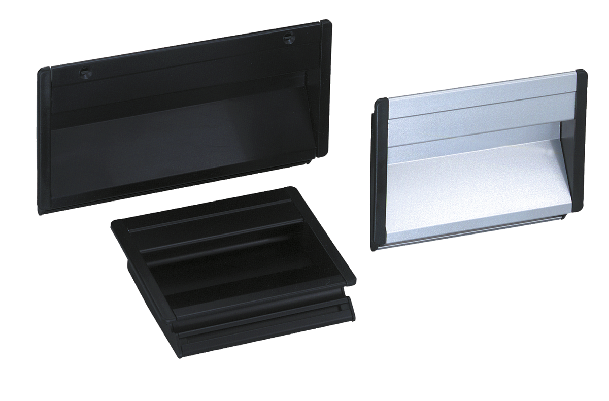 Misková madla otryskaná, satinovaná a černě nebo přírodně eloxovaná. Gumový profil černý. Upevňovací šrouby pozinkované.