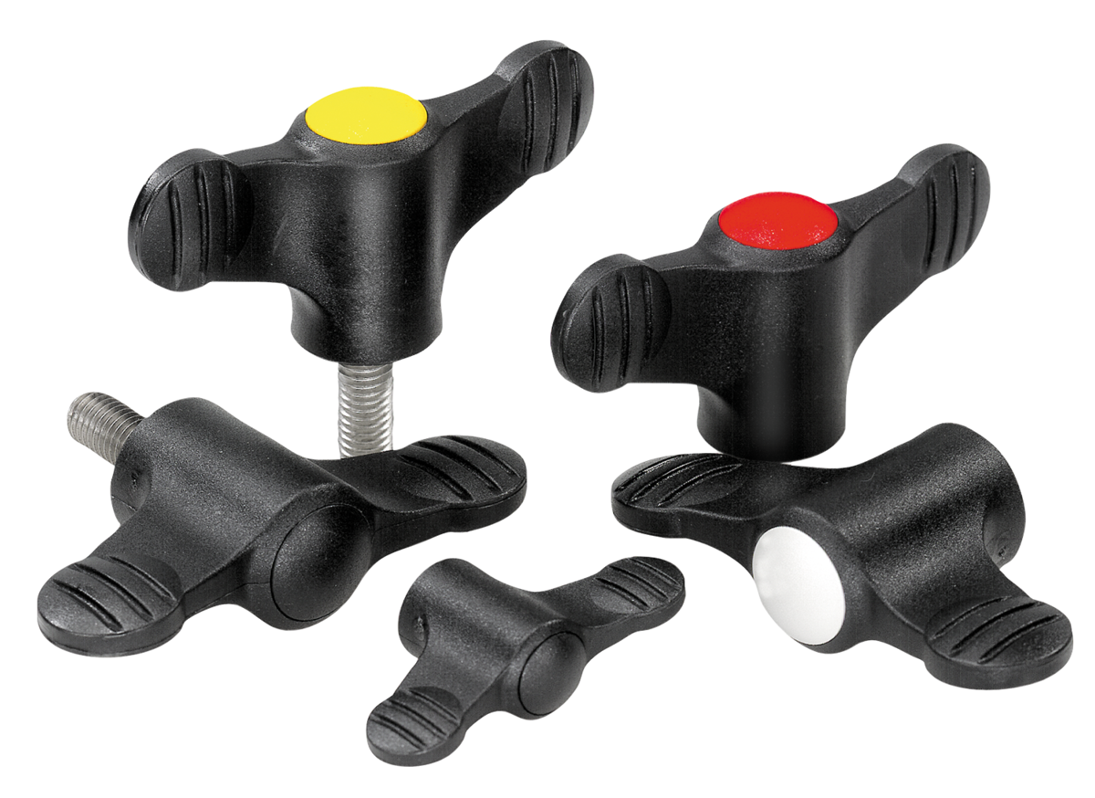 Křídlové matice s krytem z plastu, závitová vložka z oceli nebo nerezové oceli, s vnitřním závitem