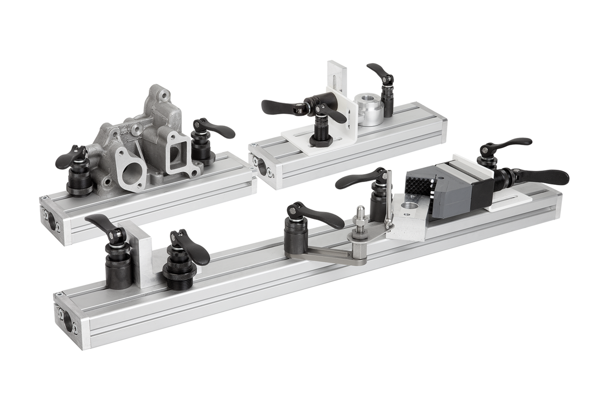Excentrické upínací moduly lze použít na běžných systémech z hliníkových profilů nebo na stolech s T-drážkami pro dorážení, pevné sevření nebo upínání dílů a obrobků.