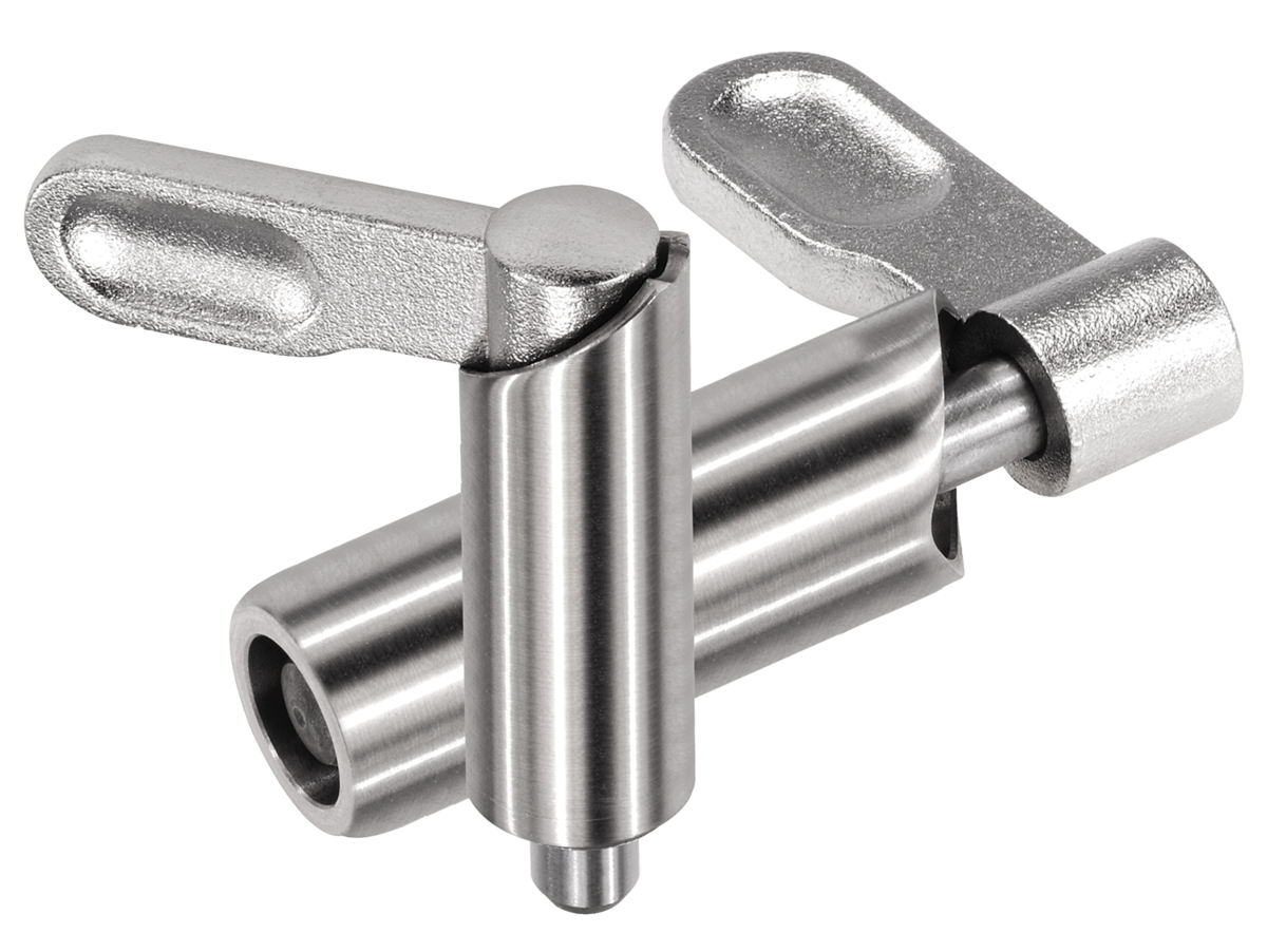 Aretační čepy ovládané páčkou se používají tehdy, nesmí-li aretační kolík přechodně vyčnívat. Otočením závory o 180° dojde k zatažení aretačního kolíku.