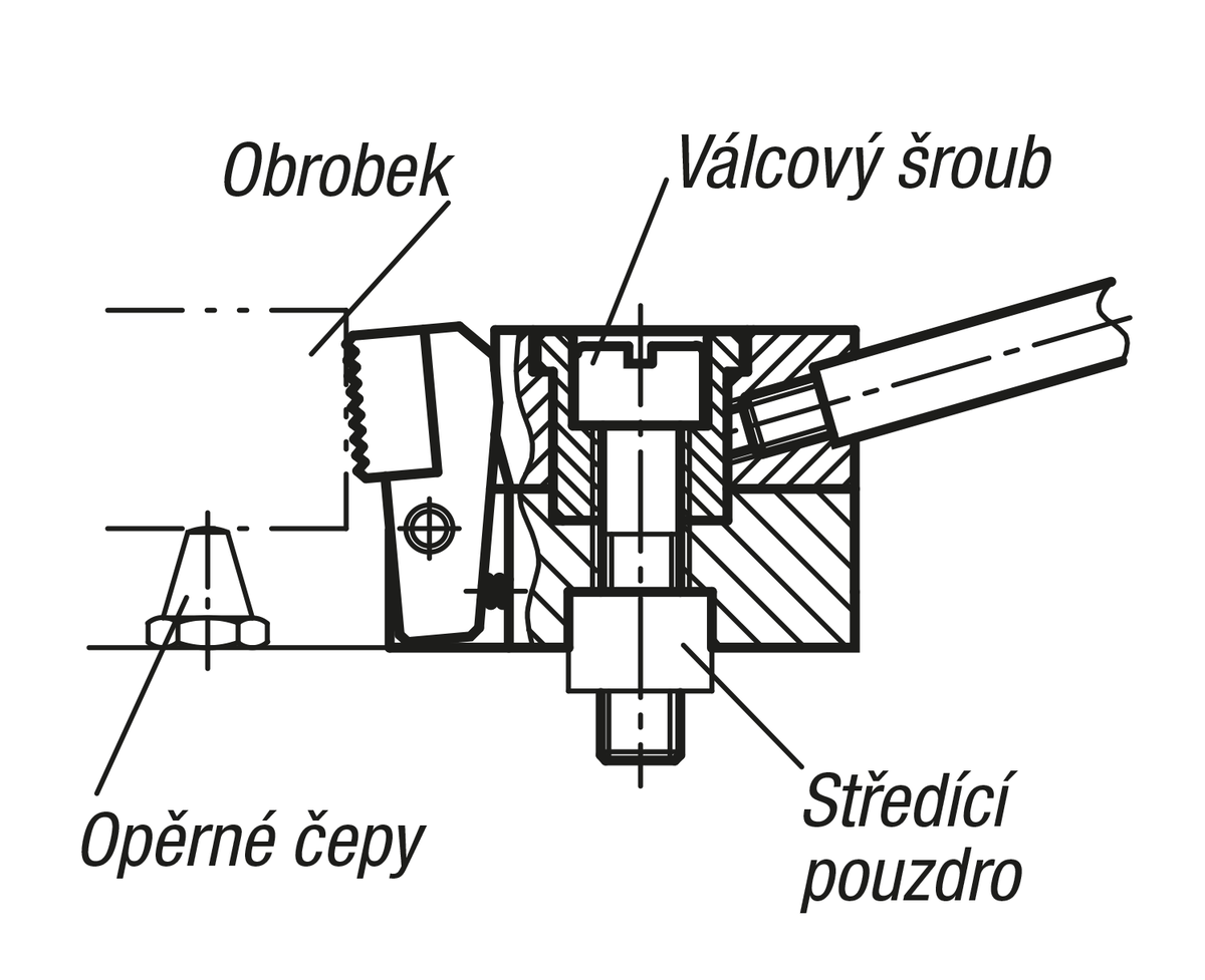 Přítlačné upínače z oceli s upínací pákou a středicím pouzdrem, upínací čelistí se dvěma vložkami z tvrdého kovu, kulatá a prizma