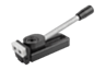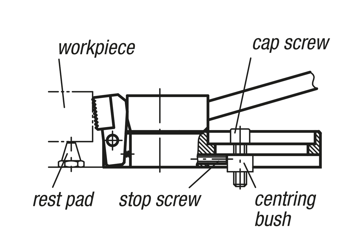 This is a quick-action side clamp where workpieces are clamped by rotating a cam wheel which exerts pressure on the swivel jaw, simultaneously producing a positive down force.